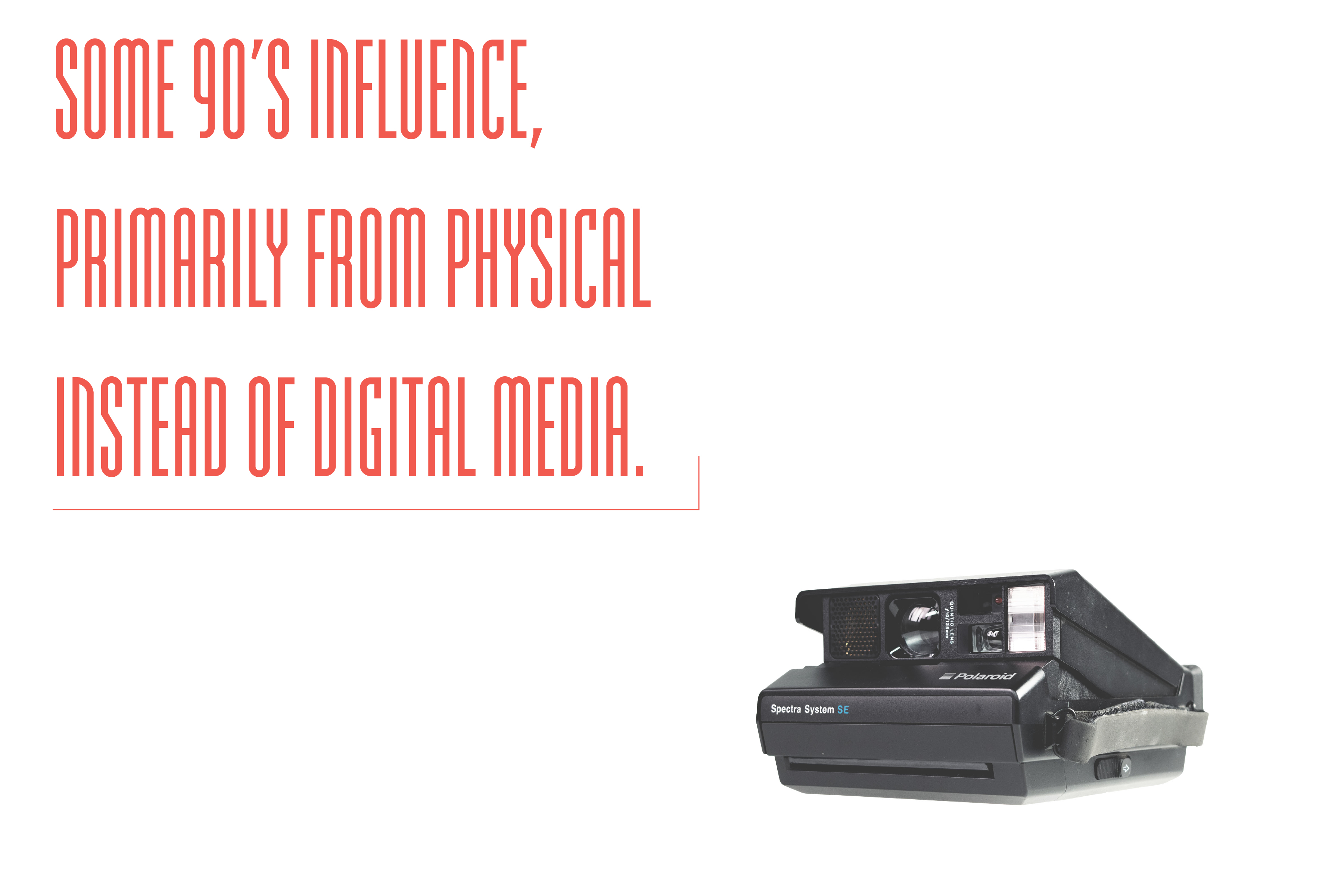 This project is a promotional site for the Polaroid Spectra. The goal of this project was to sell just how cool and quirky the camera itself is. I did this by highlighting what makes this camera different from polaroids other offerings. I took note of it’s flip up design, unique film size, and it’s 80’s / 90’s visual design. My approach took several forms, all of which are highlighted below.